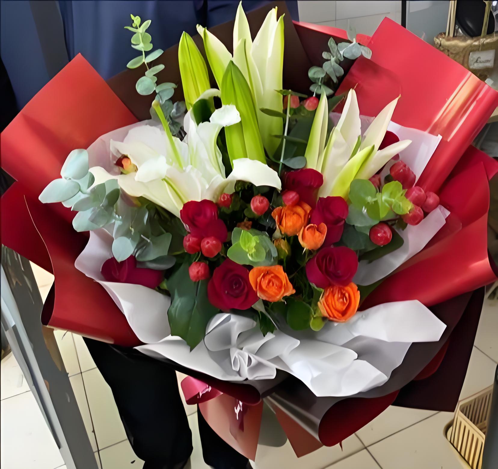 榆林定边县花店包11枝红玫瑰、2枝多头白百合、6枝橙色多头玫瑰、红豆、尤加利叶